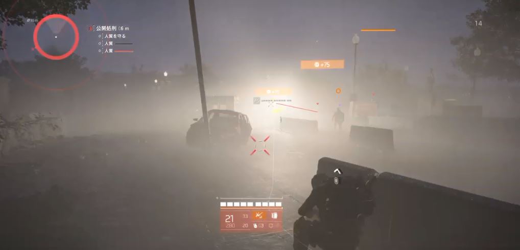 R1またはL1長押しでケミランチャーの散布場所を指定します。グレネードと同様に赤く光った範囲が爆発範囲です。R1またはL1を離すとガスを散布します。