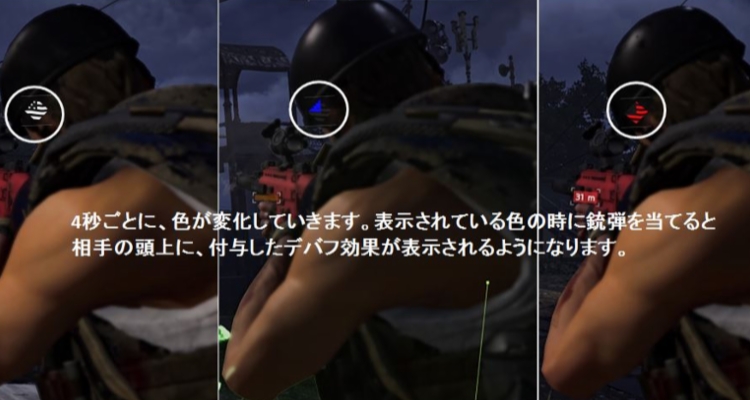 4秒に1回色のチェンジが入るので連射速度とマガジンの多いアサルト、SMGなら1マガジンで3つのデバフを与えられますがそうでない武器だといちいちリロードを挟むので、連射速度が遅くて装弾数の多いライトマシンガン(M60、M249)が、非常に相性が良いです。難易度がハード以上になると敵にエリートが多くなるため、倒しに行くというよりはガンガンデバフ効果を与えるために装弾数の多いライトマシンガンをおすすめします。